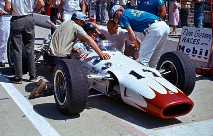On their way home from the 1962 United States Grand Prix, Chapman and Clark made a detour to Indianapolis to check out the lay of the land. Clark took his Lotus 25 for a spin around the track. Despite having less than half the horse power of the Offenhauser engine that had dominated at Indy for the last decade, his average speed was over 143 miles per hour, only 7 miles per hour short of the pole setting speed of Parnelli Jones from earlier in the year. Then Gurney and Chapman got Ford onside and persuaded them to supply the engine. Chapman-Lotus-Clark-Ford: it was a marriage made in heaven. Even though he drove for Brabham in Formula One, Dan Gurney was rewarded for his efforts and got the seat in the second Lotus.