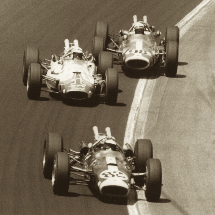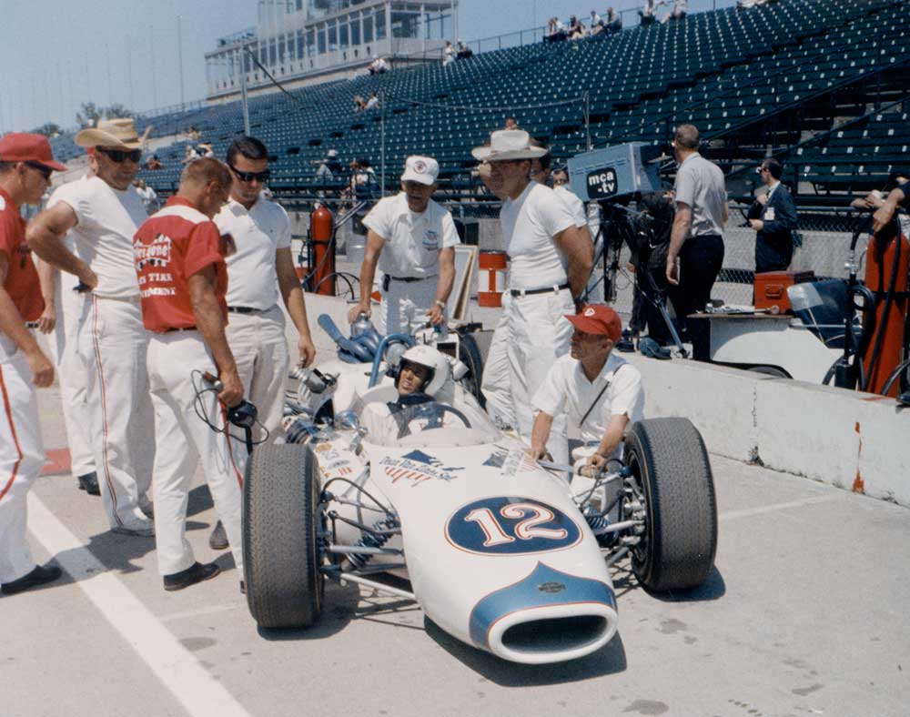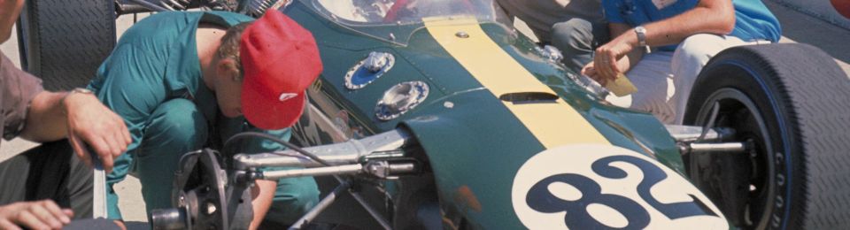 There was a racer on the podium that was at the very beginning of his open wheel career and who was participating in his first Indy 500. Clint Brawner had seen that the future for racing would require a rear engine vehicle. He had been given a wrecked Brabham chassis which he copied, inserting a Ford engine in the rear and a young Mario Andretti in the driver’s seat. The Brawner-Hawk was the only car on the grid not offset to the left, a design feature to enable better left turn performance and even up tyre wear. Andretti wrestled the car into third place due more to his sheer talent rather than because of superb machinery. The Indy 500 was the car’s maiden race, and Mario’s first time in a rear engine car. Mario and the Brawner-Hawk would go on to win the USAC National Championship that year (as well as the 1969 Indy 500). He also met Colin Chapman who said, “When you’re ready, call me.”