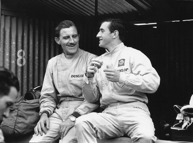 27 Jun 1965, Clermont-Ferrand, France --- Graham Hill (left) and Jackie Stewart, both drivers for BRM, sit and talk in the pit stop at the French Grand Prix in Clermont-Ferrand. --- Image by © Schlegelmilch/CorbisJackie Stewart had not arrived unnoticed in Formula One in 1965. Complete dominance of Formula 3 the previous season had resulted in multiple offers from teams great and small. Head hunted by both Lotus and BRM he was forced to choose between them. Jackie thought long and hard about the best environment to launch his Formula One career and chose BRM reasoning (correctly) that Colin Chapman and Lotus were focused completely on their star driver Jim Clark and that he would be more likely to get input and track time at BRM.