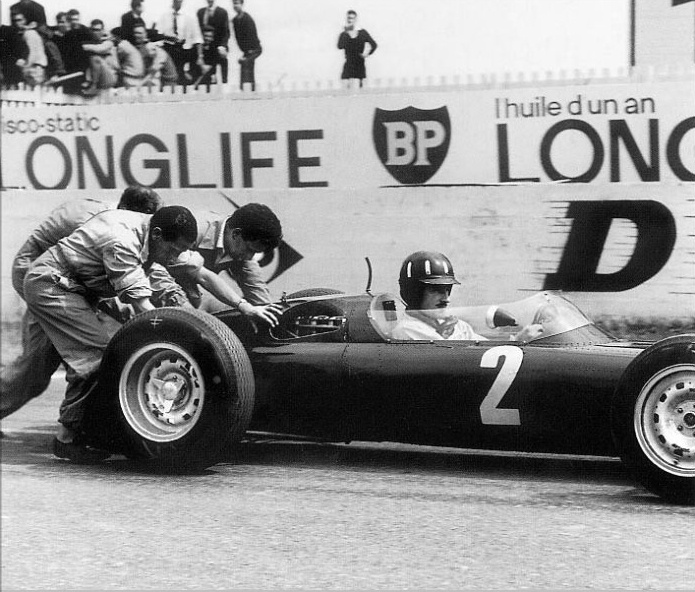 Hill in the BRM P61 being pushed off the start at the 1963 French Grand Prix – despite the one minute penalty he came third