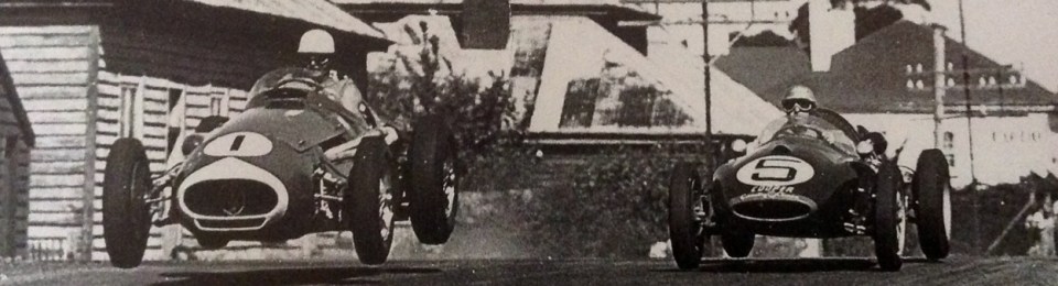 Doug Whiteford had won the first heat on Saturday in his Maserati 300S sports car. Stan Jones’s Maserati 250F had won the second heat, but his race time had been almost twenty seconds quicker than that of Whiteford, thus giving him pole position. The railway crossing saw action very early. Whiteford had just passed Len Lukey, driving a 2 litre rear-engined Cooper-Climax, for second, and had accelerated hard to try to catch Jones who had shot into the lead. Whiteford’s car became air-born as it traversed the tracks at speed. The 300S weighed 110 kg more than then 250F but utilized identical suspension. Not surprisingly this extra weight, combined with a full tank of fuel, resulted in the complete collapse of the rear of the car when it “crash landed”. Oil went everywhere, including under Len Lukey’s wheels, and he was lucky to keep his car on the road and pointing in the right direction.